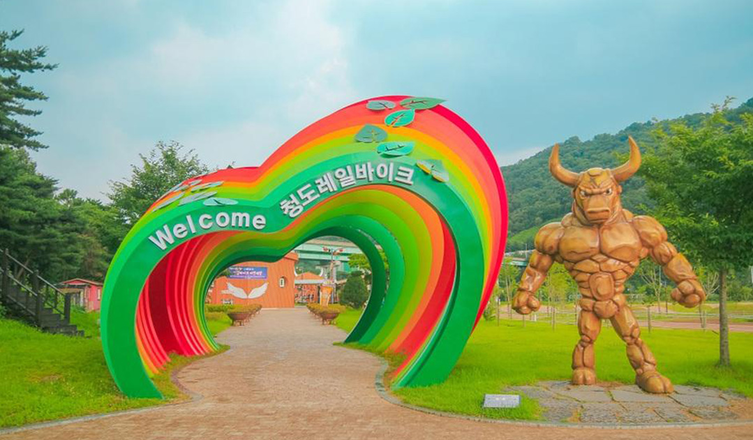 ‘소’의 고장 청도답게 은하수 다리 위에는 황소캐릭터가 레일바이크를 타는 조형물이 장식되어 있습니다.